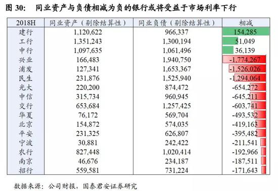 假设货币市场利率下行对影响同业的资产和负债两端,最简单的判断就是,将传统同业资产与同业负债(含存单)两者数额相减。若结果为负,说明同业负债多于资产,下半年利率下行将使其计息负债成本率下降,进而有益于净息差走扩,反之亦然。