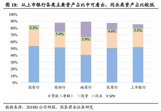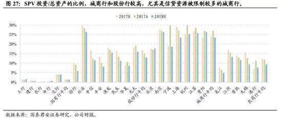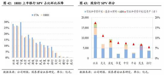 股份行和城商行SPV压降压力较大。2018H1上市银行SPV占总资产比重环比17A下降0.7pc至5.9%。横向对比来看,18H1城商行和股份行SPV占比最高,其中兴业银行、南京银行、宁波银行SPV占比排名老16家银行前三。