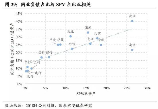 同业负债占比越高的银行,SPV占比也越高。如前文所述,银行是用短期的同业负债对接长期的表内非标资产,从上市银行的数据上就可以明显观察到该模式。
