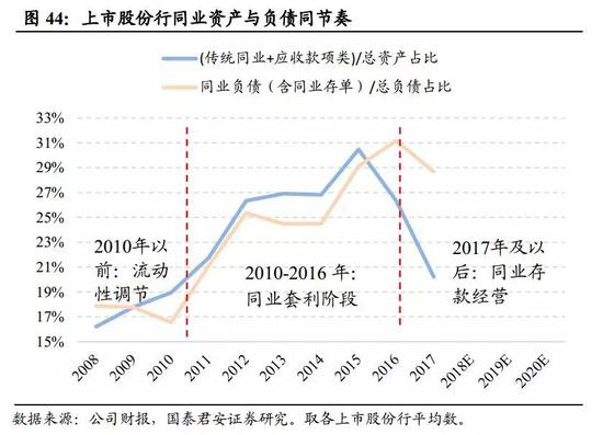 大力扩张主动负债阶段:2010年-2016年,处于上述第二三阶段的同业套利阶段,银行大力扩张主动负债。从图33中可看出,上市股份行同业负债(含同业存单)占比持续提升,挤压存款占比。无论是前述的类信贷或同业间投资模式,由于同业资产端扩张迅速、负债端的存款增速跟不上,因此主动同业负债在2010-2016年主要对接和配合同业资产而同步扩张。