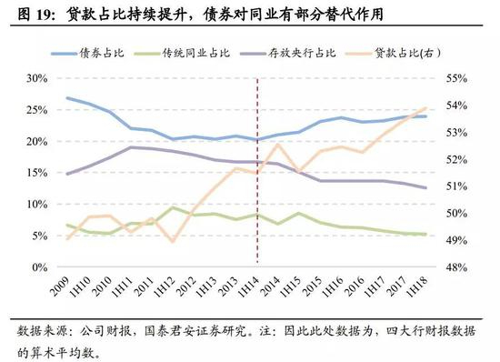 2018年开始,同业利率呈下行趋势,所以绝大多数上市银行减少传统同业资产配置,表明其对利率下行的反应和对流动性新规的反应。除了利率下行而减少同业资产配置的因素外,流动性新规的影响也不应忽略——同期限的同业资产在计算流动性匹配率时,权重高于相同期限的贷款,不利于指标达标。