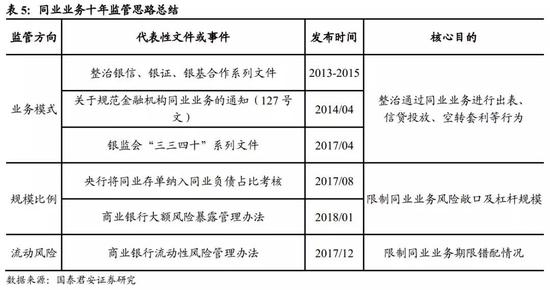 同业业务的监管始于2013年,分别从业务模式、规模比例和流动性风险三个大方面进行管控,目的是为了整治通过同业业务进行出表、信贷投放、空转套利,限制风险敞口及杠杆规模和限制期限错配。