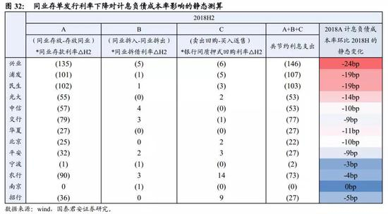 然后,我们来测算传统同业负债成本下降的影响。假设传统同业资产与同业负债的利率同向变动,相同规模的收益与成本相互抵消;于是,先将图32中各家银行2018H的三类传统同业资产与三类同业负债分别相减后得出净融资额;再乘以2018H2各类同业利率变化幅度,得出节约的利息支出;最后再同样除以2018H计息负债平均余额得到对计息负债成本率的静态影响程度。
