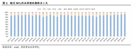 同业拆借大多为隔夜,也就是期限仅为一天。从下图的数据中可以看出,同业拆借市场中,从2015年起至今,拆出期限为1天的占比为90以上;期限为7天的占比接近6%;其他较长期限的占比几乎可以忽略。