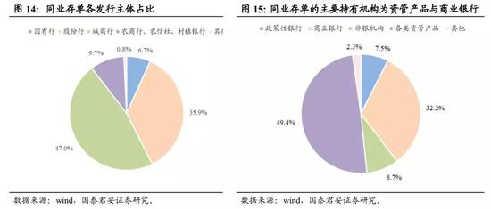 存续的同业存单中,股份行、城商行和农商行为主要发行主体;资管产品与商业银行为主要的持有机构。截至2018年10月22日,存续的同业存单中,92.5%由股份制银行、城商行和农商行发行;截止2018年9月底,根据上海清算所统计,49%的同业存单持有方为资管产品,32%为商业银行;但是资管产品中包含大量表外银行理财,所以在刚兑完全打破之前,同业存单的大部分实质是由商业银行持有。