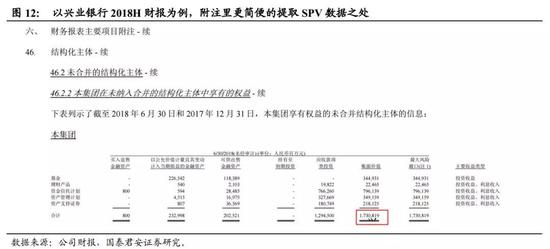 报表上还有另一处相对更方便提取的数据。还是以兴业银行2018H财报为例,该数据位于“财务报表主要项目附注”靠后的位置,二级标题为“结构化主体”,三级标题为“未合并的结构化主体”,四级标题为“本集团在未纳入合并的结构化主体中享有的权益”——此处,结构化主体即为各类SPV;整句话意思为该银行持有的SPV。