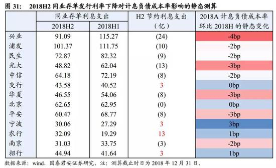 在同业存单发行量与发行价格变化的共同作用下,静态测算可发现,2018H2市场利率下行,同业存单成本最受益的银行有兴业银行、光大银行、华夏银行和平安银行等。2018H2期间,部分银行增加了同业存单的发行量,所以反而增加了相关利息支出,比如农业银行等。