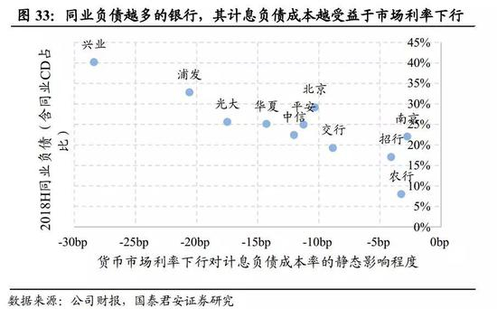从图33中可以看出,兴业、浦发和民生银行的计息负债成本率最受益于货币市场利率下行,与同业负债占比呈显著的正相关性。