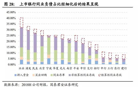 由于存款优势,国有大行同业负债(含同业存单)占比最低,占比由高到低排序为城商行>股份行>农商行>国有行。在分析计算同业负债时,为了追求准确,可将财报各类资产负债期限的披露中,“即期偿还”的同业存放归类为结算性。