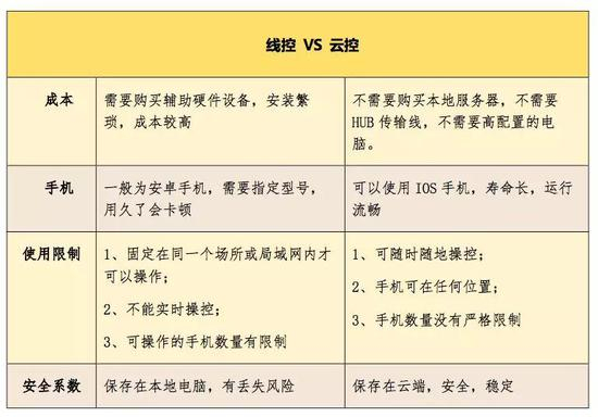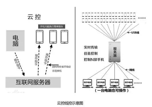 群控平台分为线控和云控。线控需要自己搭建服务器,用数据线将每个真实的手机连接至服务器。云控不需要自己搭建服务器,不受数据线地域的限制,搭载了云技术可以实现远程控制,可以用任意一台PC通过云端控制手机终端,或者使用另一部手机用ID登录云服务器。