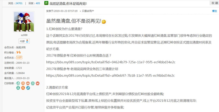 3月23日早上,已上线运营10年的老牌P2P平台红岭创投宣布清盘,董事长周世平在红岭社区公布了清盘初步方案。