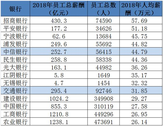 上述14家银行中,仅有中信银行人均薪资不涨反降。