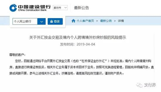 近日,建设银行在官网发布《关于外汇按金交易及境内个人跨境炒房炒股的风险提示》。在该份提示公告中,建设银行表示,我国未批准任何机构在境内开展或代理开展外汇按金交易,擅自开展、参与外汇按金交易均属于违法行为,客户应提高风险防范意识,远离非法外汇业务,谨防造成财产损失。