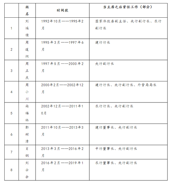基本路径都是先在央行任职,再到几大行担任一二把手,调任证监会,可见五大行行长还属于“高配”的副部级。
