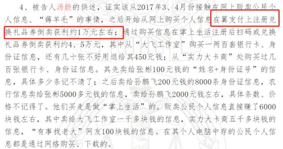 值得注意的是,孙鹏飞用来注册“掌上生活”新用户的个人身份信息是通过张彬向汤能购买,或直接从汤能处购买。