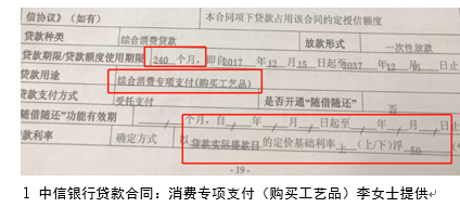 李女士称,她跟银行多次沟通才拿到了合同,仔细一看,却发现并不是住房贷款,而是一笔消费贷款,用途为“购买工艺品”。贷款期限20年,利率较基准利率上浮50%,贷款利率7.35%。