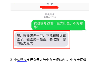 她继续向中信银行总行客服投诉,并向厦门银保监局申诉。此时,却收到了中信翔安支行负责人的短信:“提醒你一下,不能再投诉银监(指厦门银保监局)了,银监局一检查,要收贷,你的压力更大”。李女士认为这是来自银行的威胁,“此时我已经精神崩溃了”。