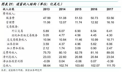 在投资管理领域,道富银行主要通过旗下全资子公司道富环球咨询为平台开展业务。在投资服务领域,其业务主要包括证券清算、证券结算、资产保管、证券交易、外汇交易、投资分析等。从其近5年收入结构中可以看出,道富银行通过为客户提供各种服务而收入的费用占总收入的75%以上,2017年达到80%。