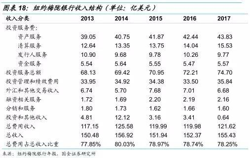 纽约梅隆银行是由纽约银行与Mellon Financial Group在2007年合并而成,其旗下有13个资产管理子公司。截止2017年底,资管规模达到1.89万亿美元,托管规模达到33.3万亿美元。纽约梅隆银行的收入主要依靠收取管理费和服务费,费用收入占总收入的78%,其中投资服务费、投资管理和绩效费用为其最重要的两块收入来源,合计占总收入的71%。