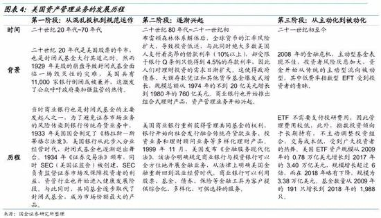 从行业监管和金融市场发展两个角度可以将美国资管业务的发展分为三个阶段。第一阶段是从二十世纪20年代~70年代,美国资管业务经历了从混乱投机到规范运作的过程;第二阶段是从二十世纪80年代~二十一世纪初,该时期资管业务有所兴起;第三阶段从二十一世纪初至今,资管业务的发展经历了从主动化到被动化的发展历程。