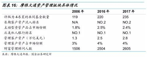 截止2017年底,摩根大通资管总额(包括资产管理和财富管理)达到2.8万亿美元,主动型资管产品占市场的份额为2.4%。管理客户资产总额占据市场份额的4%。财富管理顾问人数从2006年的1,506人增加到2017年的2,605人。在近三年收入中,资产管理业务板块收入占总净收入的10%以上,是摩根大通整体收入中占比较大的一块。近年摩根大通资管板块收入增速放缓甚至有所下降主要是由于摩根大通在发展被动型产品以及ETF,管理费用有所下降。