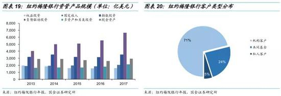 从客户结构来看,纽约梅陇银行最主要的客户是机构客户,截止2017年底,机构客户资管规模达1.35万亿美元,占整体资管规模的71%;其次是共同基金,资管规模为0.45万亿美元,占比24%;私人客户资管规模仅为0.09万亿美元,占比5%。