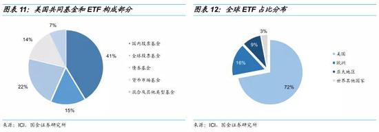 2018年,美国共同基金和ETF的主要构成部分是股票基金,占比56%,其中国内股票基金占比41%,全球股票基金占比15%。其次就是债券基金,占比22%。其余的为货币市场基金和混合及其他类型基金,分别占比14%和7%。
