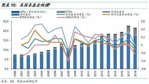 美国拥有世界上最大的资管规模。截止2017年底,美国资管总规模为30.73万亿美元,其中在SEC注册过的资管公司规模达到22.52万亿美元,目前共同基金在美国占据了主导地位,2018年主动管理的共同基金占基金净资产的64%,但与2008年占比82%的情况相比,主动管理共同基金所占份额有所下降。