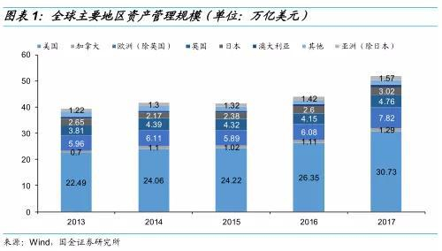 美国资管业务历史悠久,兴起于20世纪七八十年代,当时随着富裕人群和高净值人群理财需求的日益旺盛,美国银行、保险等金融机构开始大力发展资管业务。截止2017年底,美国资管规模达到30.73万亿美元,占全球主要地区资管总额的近60%,在全球资管规模排名前20的机构中,有13家是美国的资管机构,管理的资产规模达29.35万亿美元,占比70.33%。