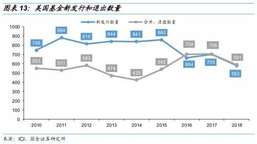 2018年美国新发行基金数量为582只,与上年相比减少123只,新发数量有所回落。同期美国合并、清盘基金数量由2014年的425只增加至2017年的706只,2018年降至591只,主要是因为这些基金逐渐失去吸引力而被迫出场。
