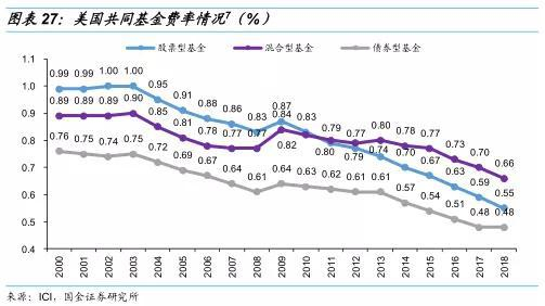 在各国的金融业中,资产管理业务的规模、种类、雇员等条件需要达到一定的条件时,才能充分发挥规模优势。美国作为全球最大的资产管理市场,其规模实现了快速扩张。一般而言,基金规模与费率呈反向变动,故基金规模的扩大推动各项业务的费用水平持续下降,逐渐趋向合理区间。从长期看来,股票型基金、混合型基金和债券型基金的平均费率均保持下降态势,其中股票型基金费率下降幅度最大。2000年,股票型基金的平均费率为0.99%,即投资100美元基金的费用为0.99美元,2018年平均费率降至0.55%,降幅达40%。