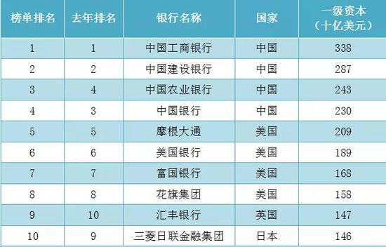 中国四家大型商业银行再次位列1000大银行前四名。与2018年榜单相比,前10大银行名单整体基本保持不变,中国的四家大型银行连续第二年包揽排行榜前四名,其中中国工商银行连续七年名列榜首,中国建设银行保持第二名位置不变,中国农业银行上升一位至第三名,中国银行排名第四位。除前四名以外,包括摩根大通、美国银行、富国银行和花旗银行在内的四家美国银行分列五至八位,英国汇丰银行上升一位取代日本三菱日联金融集团排至第九位。