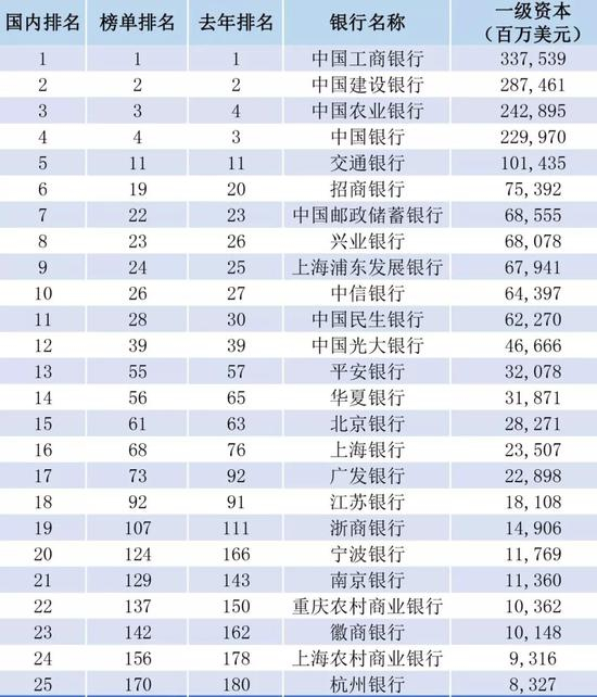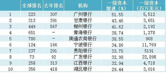 与此同时,中资大型银行总资产维持增长,但增速放缓。国内排名前10的中资银行,只有中国农业银行的一级资本实现两位数增长,达到11%,其余除兴业银行和招商银行以外,一级资本增长均未超过6%。但整体来看,包括城商行和农商行在内的部分中型银行增速仍较高,例如广州银行一级资本增长了51.55%,排名提升84位至第223位;宁波银行一级资本增长了34.86%,排名提升42位至第124位。
