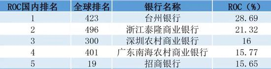 在ROC指标上,中资银行也有较为亮眼的表现。排名国内前五的是台州银行(28.69%)、浙江泰隆商业银行(21.32%)、深圳农村商业银行(16%)、广东南海农村商业银行(15.77%),以及全球排名19位的招商银行(15.65%)。