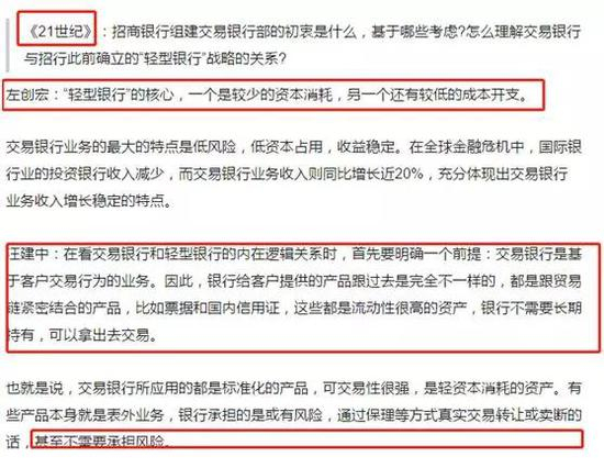 招行是国内首家成立交易银行部的银行, 21世纪经济报道记者曾经就此事采访了招商银行公司金融总部总裁汪建中和招商银行交易银行部总经理左创宏。在采访中,记者提问组建交易银行部的初衷,左创宏回答表示,“轻型银行”的核心,一个是较少的资本小号,另一个还有较低的成本开支。交易银行业务的最大特点是低风险、低资本占用,收益稳定。