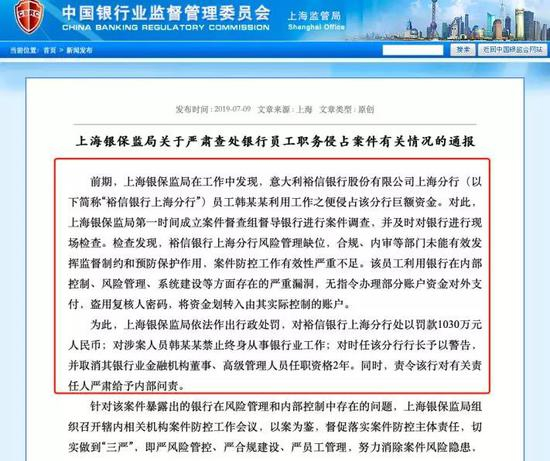前期在工作中发现,意大利裕信银行股份有限公司上海分行员工韩某某利用工作之便侵占该分行巨额资金。对此,上海银保监局第一时间成立案件督查组督导银行进行案件调查,并及时对银行进行现场检查。