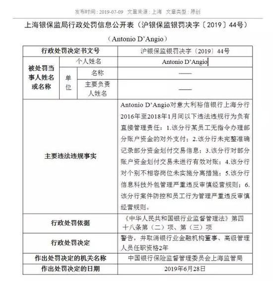 从上海银保监局7月9日发布的罚单信息公告中(作出的处罚日期是6月28日),可以看到,该行一位董事Antonio D’Angio被取消银行业金融机构董事、高级管理人员任职资格2年。案由是,对上述6项主要违法违规事实具有直接管理责任。
