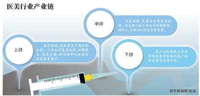 新京报记者查阅多份行业报告与白皮书发现,医美行业产业链一般被分为上游、中游、下游三个部分,上游主要是医疗器械、药品等生产商和供应商,上市公司复星医药双鹭药业冠昊生物、新华锦等均收购有这类医美资产。中游主要是大型医院、民营企业等医美机构,如新三板上市公司华韩整形、俏佳人,以及正在IPO的艺星医美等。下游则是客户,以及新氧与更美等连接医美机构与客户的美容整形电商平台。