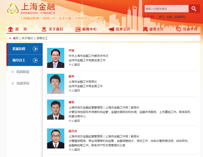 此次更新之后,上海金融领导班子为:中共上海市金融工作委员会书记严旭,上海市金融工作局局长解冬,上海市地方金融监督管理局(上海市金融工作局)副局长李军、赵万兵。