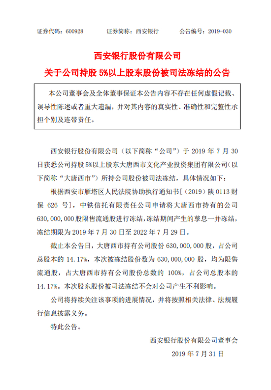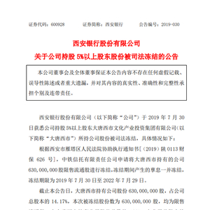 新浪财经讯 7月31日消息,西安银行发布公告称,该行于7月30日获悉公司持股5%以上股东大唐西市文化产业投资集团有限公司(以 下简称“大唐西市”)所持公司股份被司法冻结。