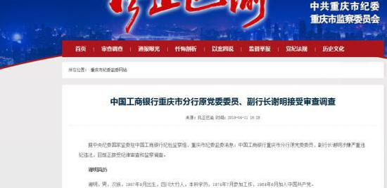此前的4月11日,工行重庆市分行原党委委员、副行长谢明涉嫌严重违纪违法,接受纪律审查和监察调查。