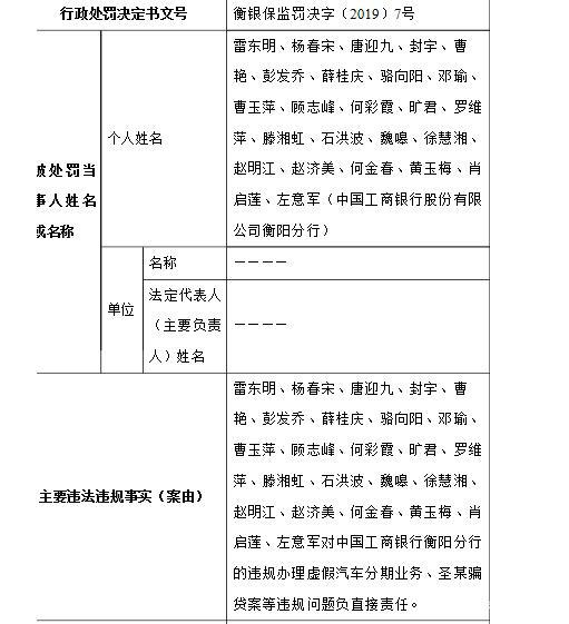 今年1月30日,衡阳银保监分局对工商银行衡阳分行共24名负责人做出处罚,处罚理由为“对工商银行衡阳分行的违规办理虚假汽车分期业务、圣某骗贷案等违规问题负直接责任”。其中2人领到终身禁业的“顶格处罚”,5人被处以禁止三年或五年从事银行业工作,1人被取消任职资格三年,17人被给予罚款或警告。