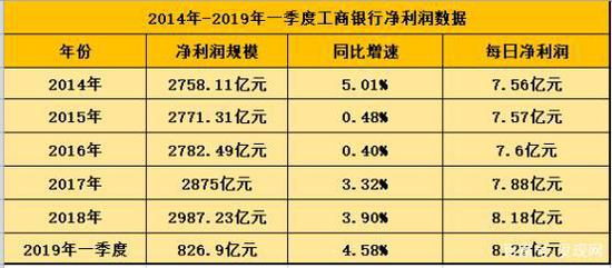 被称为宇宙行的工商银行,连续多年占据国内最赚钱银行榜首,值得称赞。据公开数据显示,2017年-2019年一季度末,工商银行实现净利润分别是2875亿元、2987.23亿元、826.9亿元;每天净赚7.88亿元、8.18亿元以及8.27亿元,当之无愧的最赚钱银行。