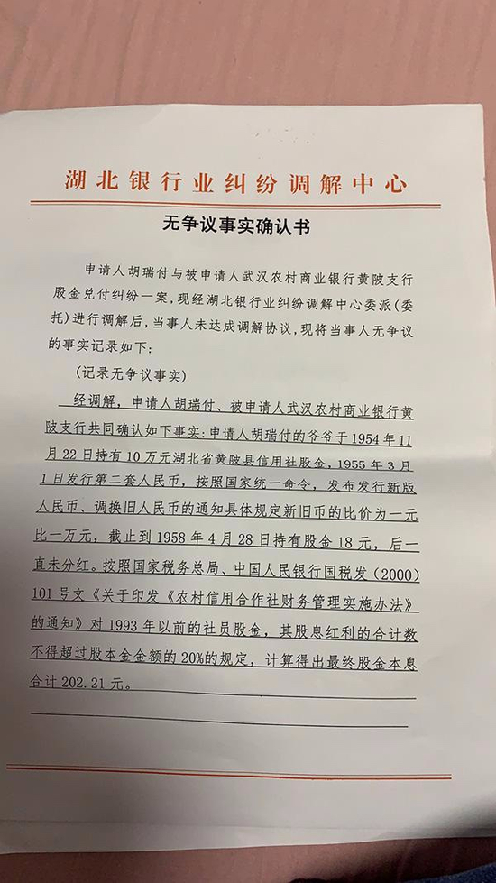 胡瑞付手中的股金便是依照这一兑换比例来计算的。根据湖北银行业纠纷调解中心出具的《无争议事实确认书》显示,截止到1958年4月28日,胡瑞付的爷爷持有股金18元,后一直未分红。
