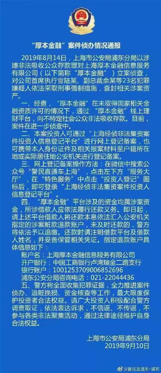今年8月14日,上海浦东警方以“涉嫌非法吸收公众存款罪”对上海厚本金融立案侦查,对公司CEO陆某、副总裁佘某等23名犯罪嫌疑人依法采取刑事强制措施,查封相关涉案资产。警方在通报中要求投资人在指定的平台上进行登记备案。