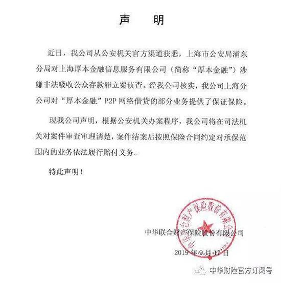 中华财险对证券时报回复,“经我公司核实,我公司上海分公司对‘厚本金融’P2P网络借贷的部分业务提供了保证保险。现我公司声明,根据公安机关办案程序,我公司将在司法机关对案件审查审理清楚,案件结案后按照保险合同约定对承保范围内的业务依法履行赔付义务。”