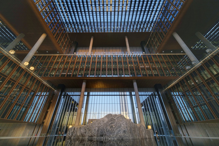 大厦以“鲁班锁”为设计理念,从高空俯视为“中国结”造型,寓意“中国结,连接世界”,搭配大象灰和中国铜主体色系。