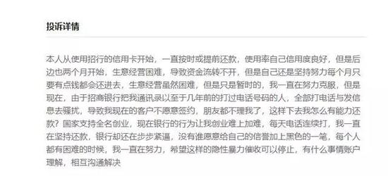 投诉人杨女士表示:从使用招行的信用卡开始,一直按时或提前还款,信用度良好,但是后边两个月开始,生意经营困难,导致资金流转不开,但依然努力每个月只要有点钱都会还进去,由于招商银行把我通讯录以至于几年前的打过电话号码的人,全部打电话与发信息去骚扰,导致我现在的客户不愿意签约;并希望这样的隐性暴力催收可以停止,有什么事情账户理解,相互沟通解决。(有删改,全文见下图)