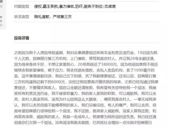 另有一名实名投诉人周先生直言招商银行信用卡的第三方催收软暴力,他表示:个人原因导致逾期,对此事愿意偿还所有本金利息及违约金,19日因为我个人欠款,招商银行第三方机构,上门催收、辱骂,后为还债周先生找朋友借款,去私人卖血机构卖血,但因为没有还剩6000元没有偿还,家人又遭骚扰,现在周先生已经将欠款全部还清,周先生希望有关领导给一个说法。