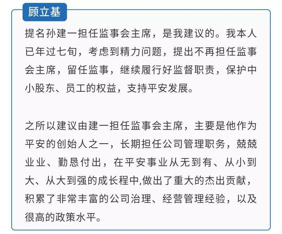 顾立基于1994年9月28日至1997年10月28日期间曾任平安集团副董事长,自2009年出任平安集团监事会主席,见证了平安从创立初期至今的发展历程。